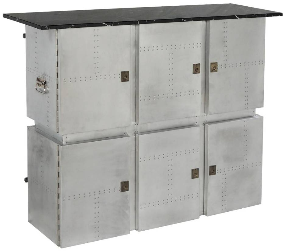 The Brancaster bar table is a handsome statement piece combining the warmth of natural materials with the industrial appeal of a marble top. This black marble top bar table is finished with an aluminum frame for exceptional color depth and features six patchwork aluminum doors.Read More