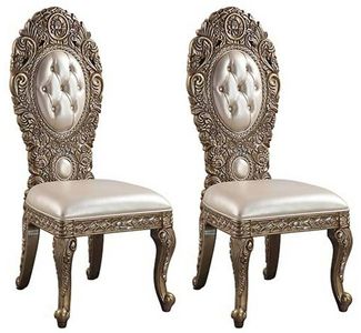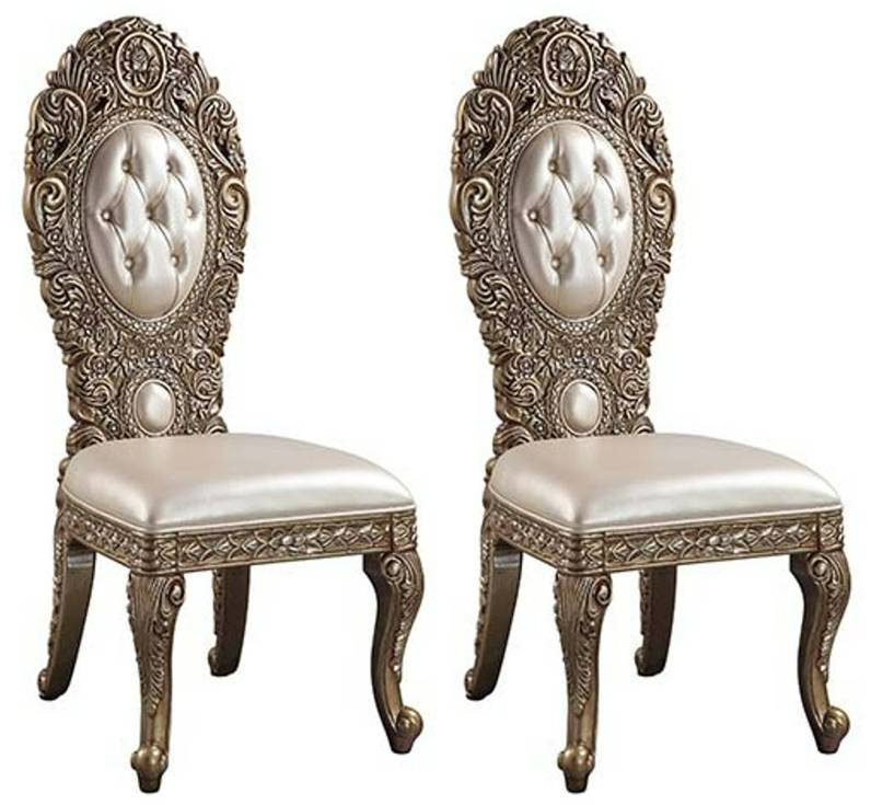 Ornate scrollwork and endless details the Constantine collection takes inspiration from the Baroque era to make up this dining set. The chairs are visually striking on their own with ornate carvings and upholstered in bone PU that feature button tufted backrests.Read More