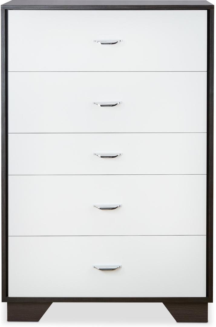 This beautiful Eloy chest of drawers boasts of contemporary style, five drawers with metal drawer handles. Crafted with multi shades of walnut and espresso, the raw wood texture enhances this dresser's sleek style and the drawers provide plenty of storage space for clothes and more. Some Assembly Required.Read More
