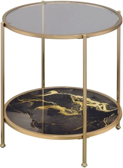 This sleek Fiorella end table brings a modern touch to any space in your home. The table is supported by a metal frame with a refined gold finish, creating a striking contrast with the black marble print. The tabletop and a matching lower shelf, both made from tempered glass.Read More