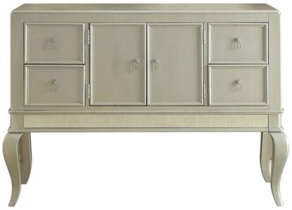 Elevate your dining area with the Francesca Champagne Server. Finished in a stunning champagne hue, this server features four drawers and two wooden doors with one shelf inside for ample storage.Read More