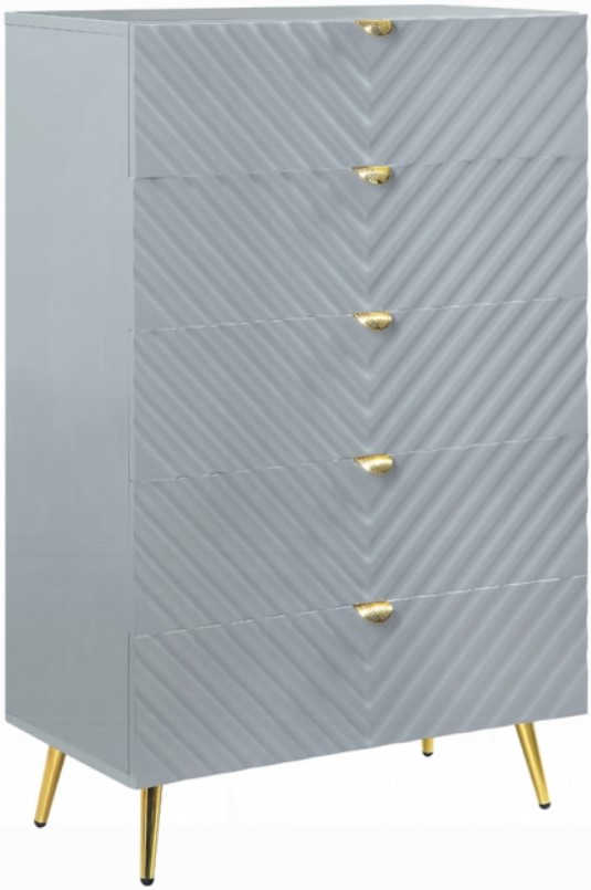 The Gaines collection is a glamorous and sophisticated grouping that adds a chic style to any room. The gray gloss finish and gold metal accents help to accentuate the clean lines of the pieces and add a pop of glamour. The diagonal line design adds visual interest and texture.Read More