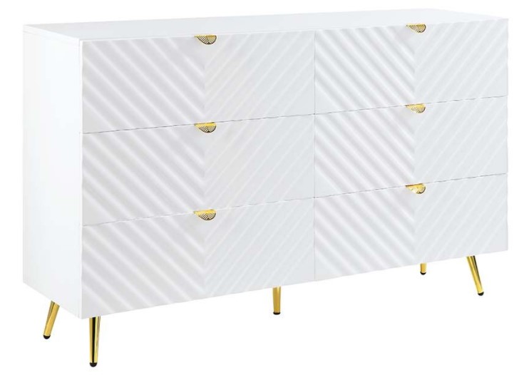 The Gaines Collection is a glamorous and sophisticated grouping that adds a chic style to any room. The white gloss finish and gold metal accents help to accentuate the clean lines of the pieces and add a pop of glamour. The diagonal line design adds visual interest and texture.Read More
