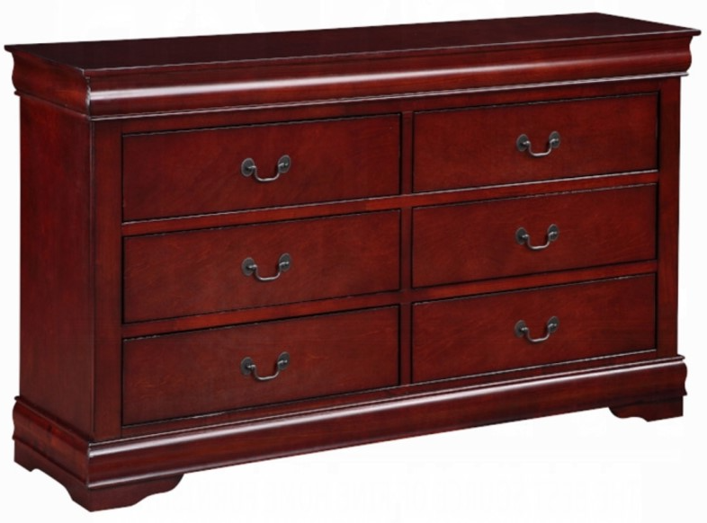 The Louis Philippe dresser in cherry finish is constructed of solid wood in finish options for customization. It features six drawers with metal drop handle pulls, perfect for storing clothing and bedding. Add the optional mirror to create a complete set.Read More