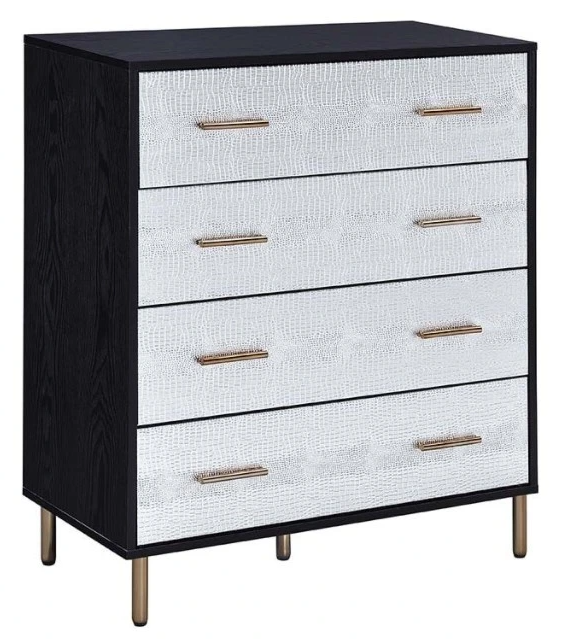 This Myles's chest is a charming addition to your bedroom, with four drawers that are perfect for storing clothing and other miscellaneous items. The chest is finished in a black frame and with alluring gold hardware and legs, then accentuated by decorative drawer fronts that feature silver faux crocodile texture.Read More