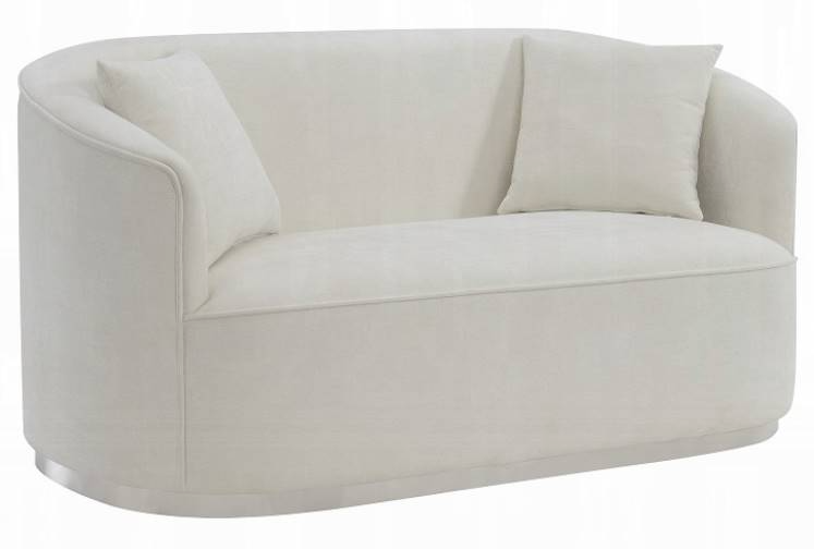 Unwind and rest when seated on this luxurious beige chenille Odette loveseat. This lovely loveseat is just the thing to inject drama into your living space. The plush seating offers countless hours of relaxation. The unique barrel shape immediately commands attention, and the brushed chrome stainless steel detailing finishes off the base in contemporary panache.Read More