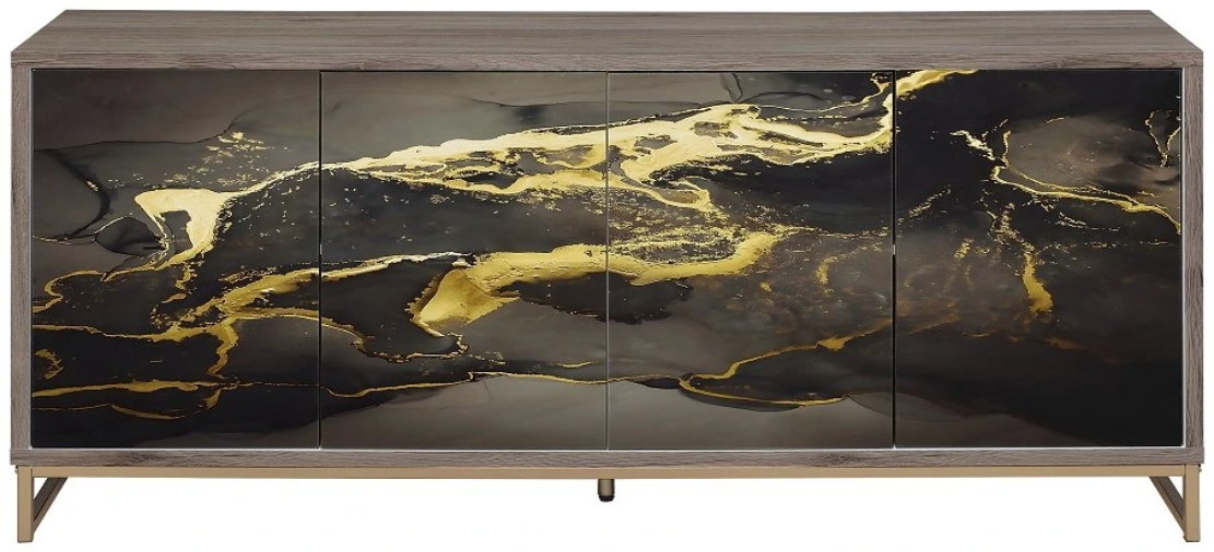 Make your home a mecca for modern luxury with this Payo console cabinet. Black finishes pair with faux marbled door fronts and oak finish frame to create this luxe piece. The champagne base is the perfect finishing touch that adds fashionable stability.Read More