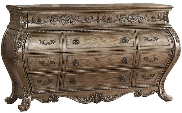 The Ragenardus dresser is an impeccable example of truly memorable luxurious traditional design. This eleven-drawer vintage oak dresser features a detailed French style front and English back in a stunning Bombay shape case, Felt-Lined top drawer, side metal glides, scrolled legs and antique pull-ring handles.Read More