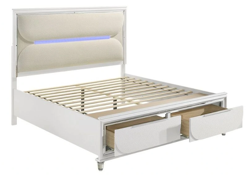 The Tarian bedroom collection will add stylish glamour with a refined touch of glitz to your bedroom! Sturdily crafted for long-term use, this bed is finished in a fresh and alluring peal white. The headboard features hidden LED lighting and comfortable boucle padding.Read More