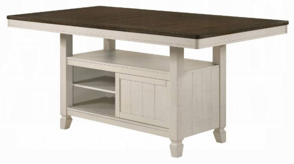 Pick the right seating for your dining room, the counter height chairs provide traditional slatted backrests, and the matching backless stool is padded with nail-head trim. Finished in an oak and antique white, creating the perfect contrast. With plenty of storage and the perfect balance of open and closed space, this Tasnim collection brings a whole new dimension to your dining space.