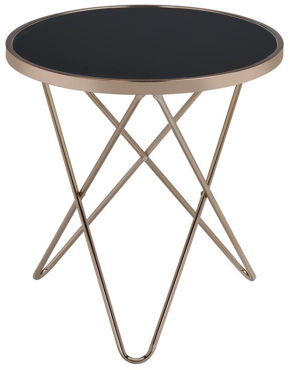 Update your living room with a functional art piece. The Valora end table uses a mid-century inspired base finished in champagne and supports a framed black glass top. The finish and black glass make for a sophisticated look.Read More