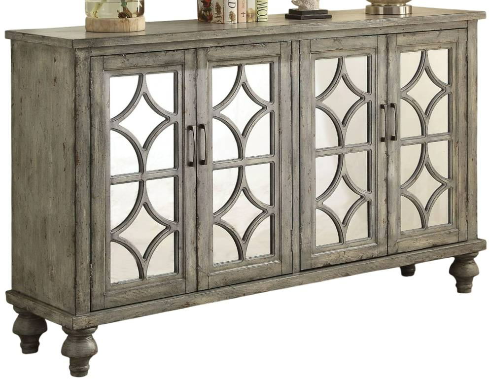 Featuring a weather gray finish with mirrored glass doors and a diamond trim inlay. Four cabinet doors open on the wood console table to reveal ample shelf space for additional storage. The modern style cabinet with gray tones, matching gray inlay and bun legs will add a stylish accent to every room in your home.Read More