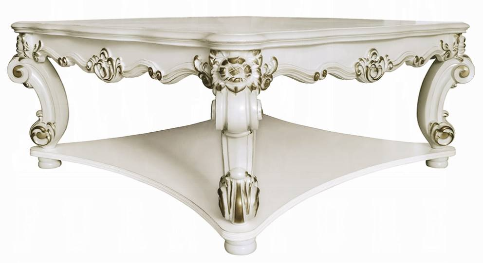 The shelf below the tabletop provides extra storage space for magazines, remote controls, or decorative items. The antique pearl white finish adds the perfect amount of vintage charm. Crafted with meticulous attention to detail, this coffee table seamlessly blends functionality with timeless aesthetics. The combination of the scrolled details and bun legs creates an eye-catching piece that exudes elegance and refinement.