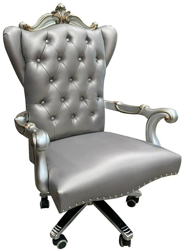 The Versailles executive arm chair classic style will blend masterfully in your home. Carefully constructed from faux leather, and selected veneers in rich antique platinum finish. Highly decorative details, button tufted backrest with Nailhead trim, and its decorative moldings are complemented by hand brush accent finish which gives this piece an elegant and sleek appeal.Read More