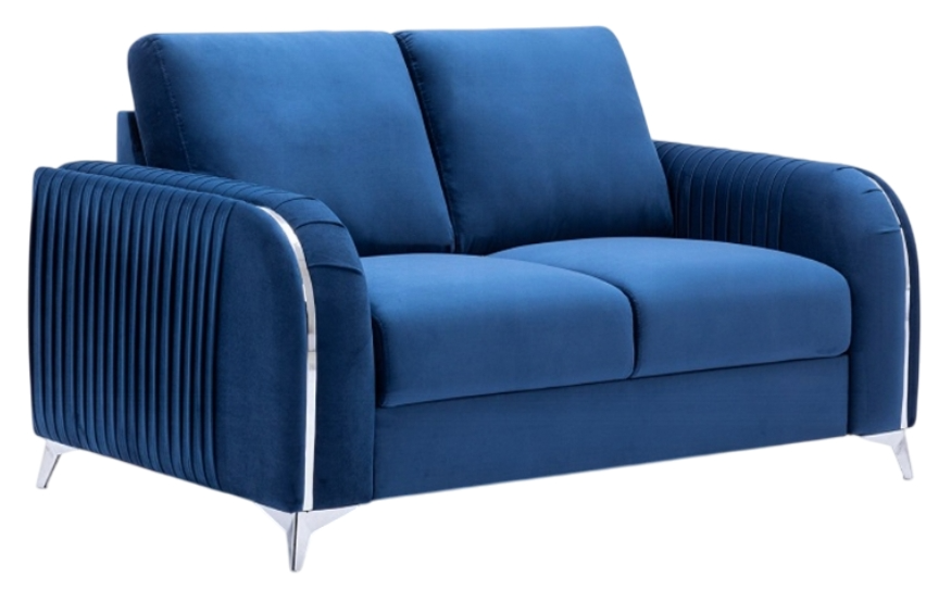 Make a bold statement with the Wenona blue velvet loveseat. The blue color of the velvet upholstery is a classic color that will provide a fun pop of color in any home. This loveseat is highlighted with polished chrome trim accents along the armrests and legs to match.Read More