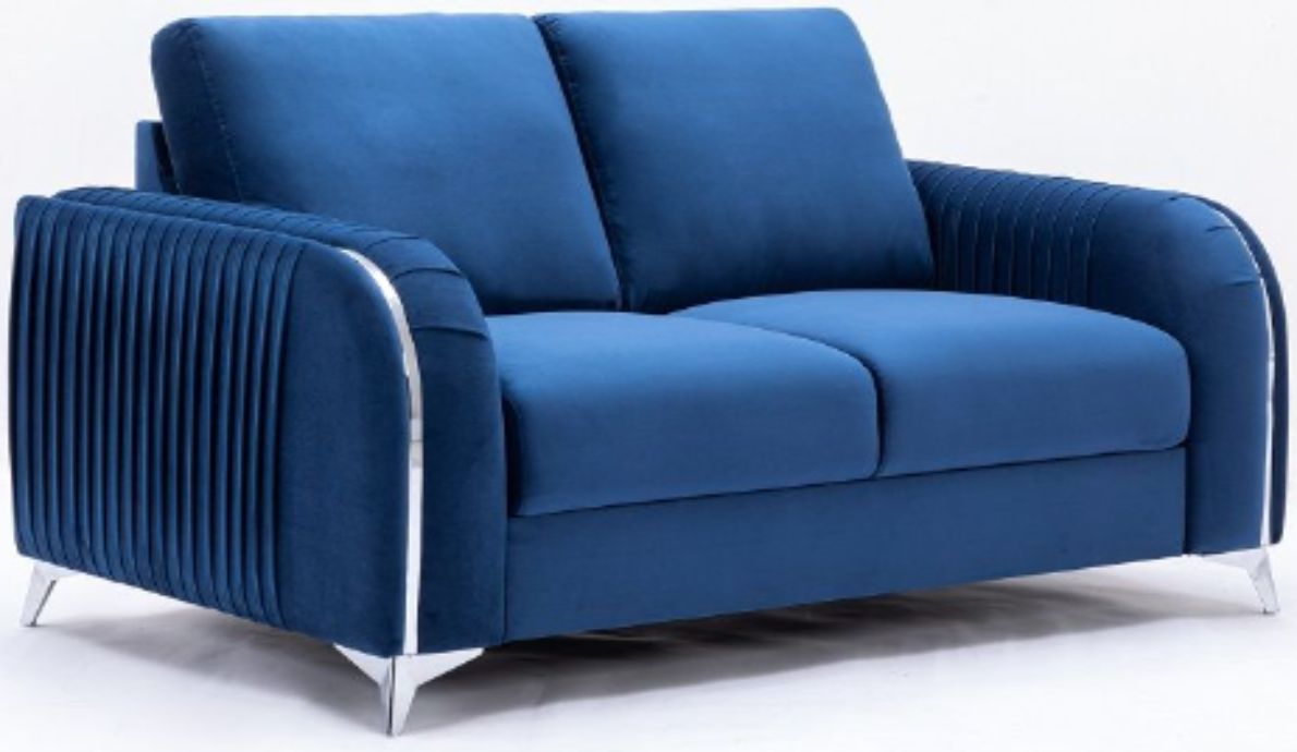 Make a bold statement with the Wenona blue velvet loveseat. The blue color of the velvet upholstery is a classic color that will provide a fun pop of color in any home. This loveseat is highlighted with polished chrome trim accents along the armrests and legs to match.Read More