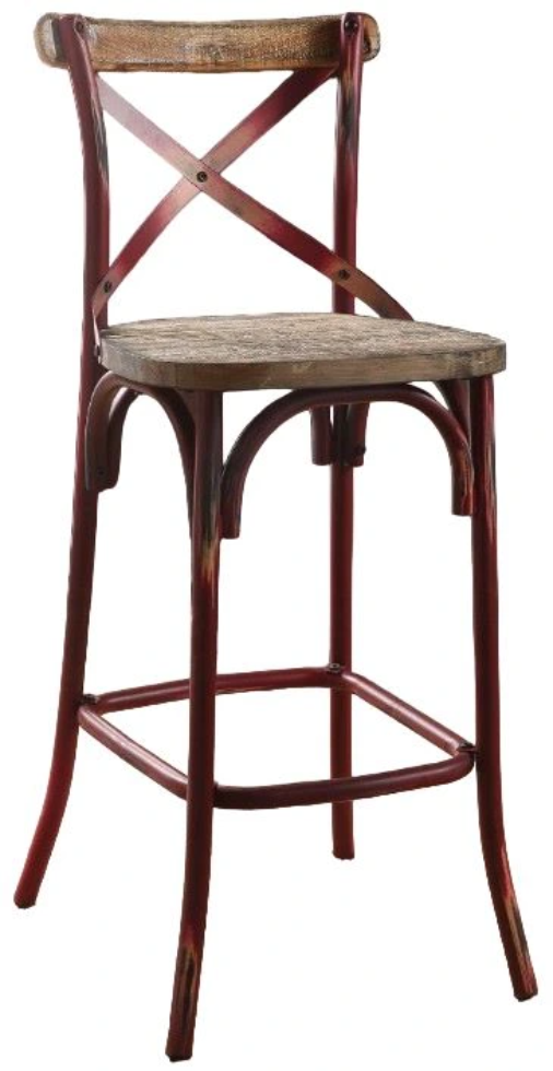 The Zaire collection chairs offer vintage-style bar chairs. It features reclaimed wood and metal looks, a simple "X" style backrest, a wooden seat, and a slightly flared four-legged base with footrest supports.Read More