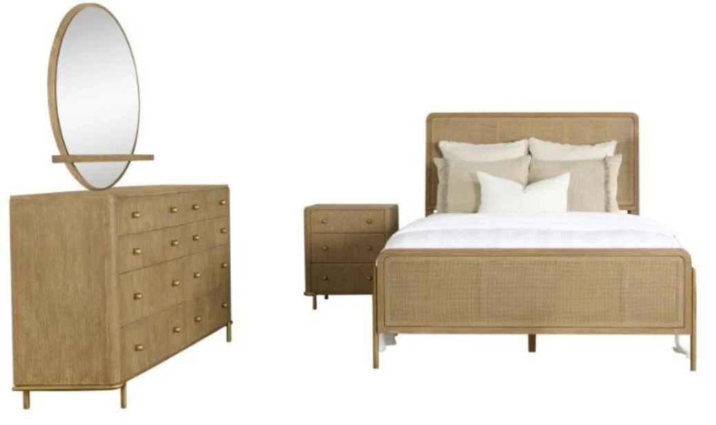 Create an elegant retreat with this mid-century modern bedroom set, featuring a wire-brushed, sand wash finish across its woven cane panel bed and matching pieces. Woven cane panels offer a vintage feel along with soft, curved corners and lustrous aged brass metal hardware throughout.Read More
