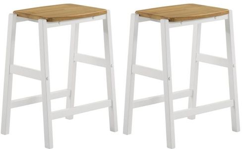 Its flat seat received a natural brown wood finish, offering inviting warmth to your counter seating. Its base boasts a sawhorse-inspired profile with flared legs and stretcher bars, all in a crisp white finish that brightens surrounding decor. Lower stretchers double as a footrest, ensuring comfort and support whether you're stopping for a quick cup of coffee in the morning or catching up with the kids over dinner.