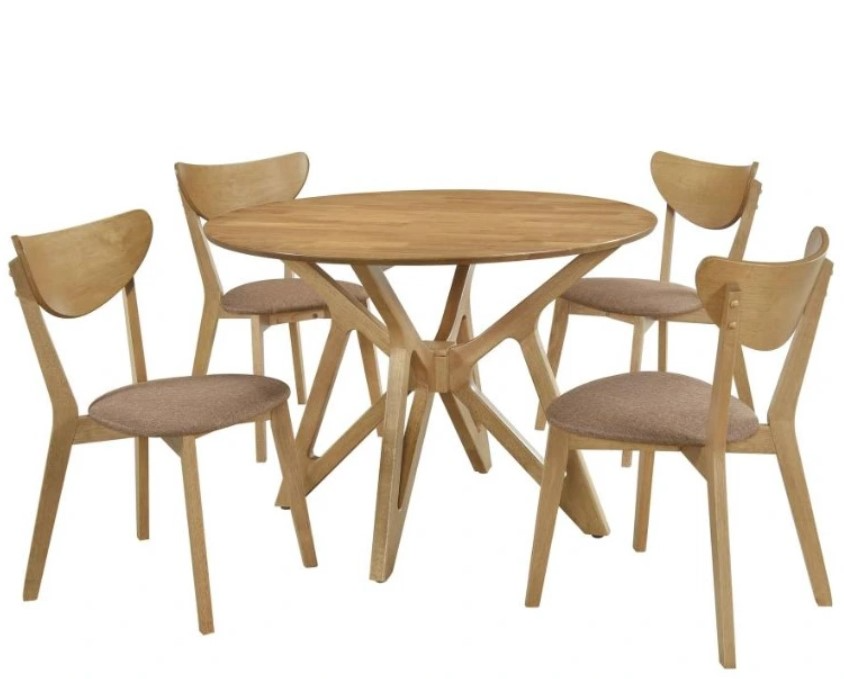 Embrace island inspiration with this five-piece hardwood dining set. Featuring a round, beveled tabletop in a light walnut finish, it’s perfect for compact spaces. The interlocking wood base and mid-century chairs with splayed legs, curved backrests, and upholstered seats offer style and comfort, ideal for everyday use.Read More