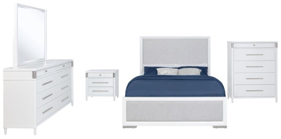 Includes: One (1) queen bed, one (1) nightstand, one (1) dresser, one (1) dresser mirror, and one (1) chest of drawers