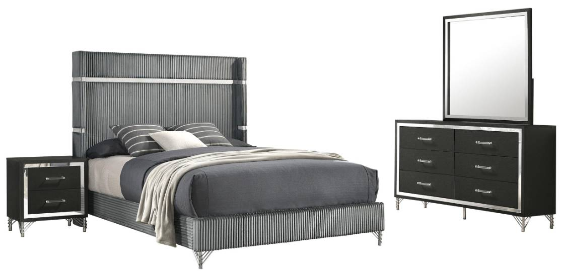 Effortlessly blending inviting softness and timeless sophistication, this four-piece modern bedroom set creates a rich but inviting ambiance. It centers on a stylish upholstered bed that pairs grey velvet upholstery with a fluted look, creating impressive texture and dimensionality.Read More