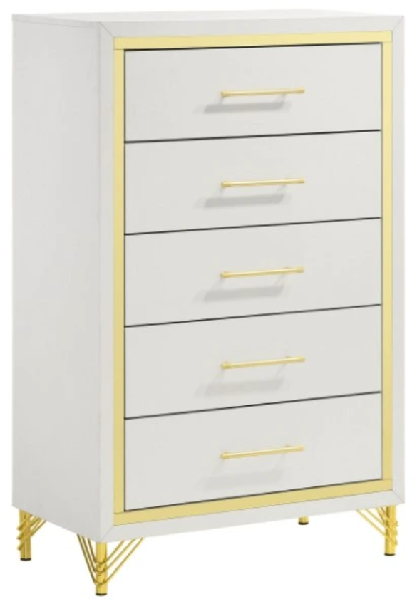 This elegant chest features a clean white finish with gold-tone accents and slender, angled legs. five spacious drawers offer ample storage, each lined for added protection. Its sleek design blends classic charm with contemporary flair, making it a stylish and functional addition to any bedroom.Read More