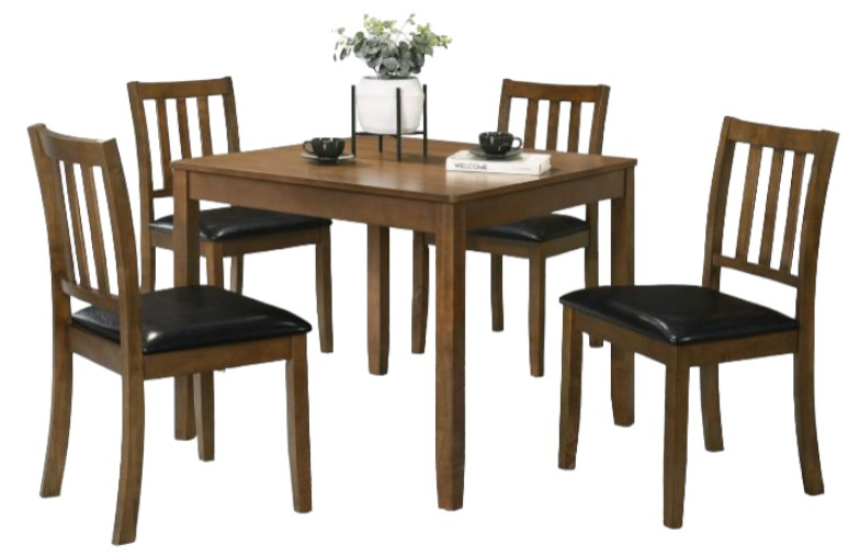 Perfectly sized for a breakfast nook or compact dining room, this contemporary five-piece dining set offers inviting style and a compact profile. The set centers on a square dining table crafted of wood with okume veneer in a stylish, neutral finish. Four chairs complete the set, offering comfort with plush foam padded seats and black faux leather upholstery.Read More