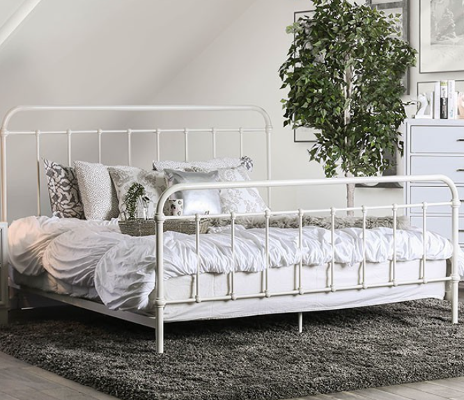 Simple yet eye-catching, this bed features full metal construction to emphasize the elegantly modern appearance. Seven spindles accentuate the headboard and footboard while offering added support for the entire bed. Powder coating available in two finishes: dark bronze or vintage white.Read More