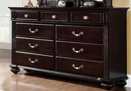 This dresser provides ample drawer space for organizing clothing and daily essentials. Finished in a dark walnut tone, it offers a refined look while sturdy construction ensures durability and dependable performance for everyday bedroom storage needs.Read More