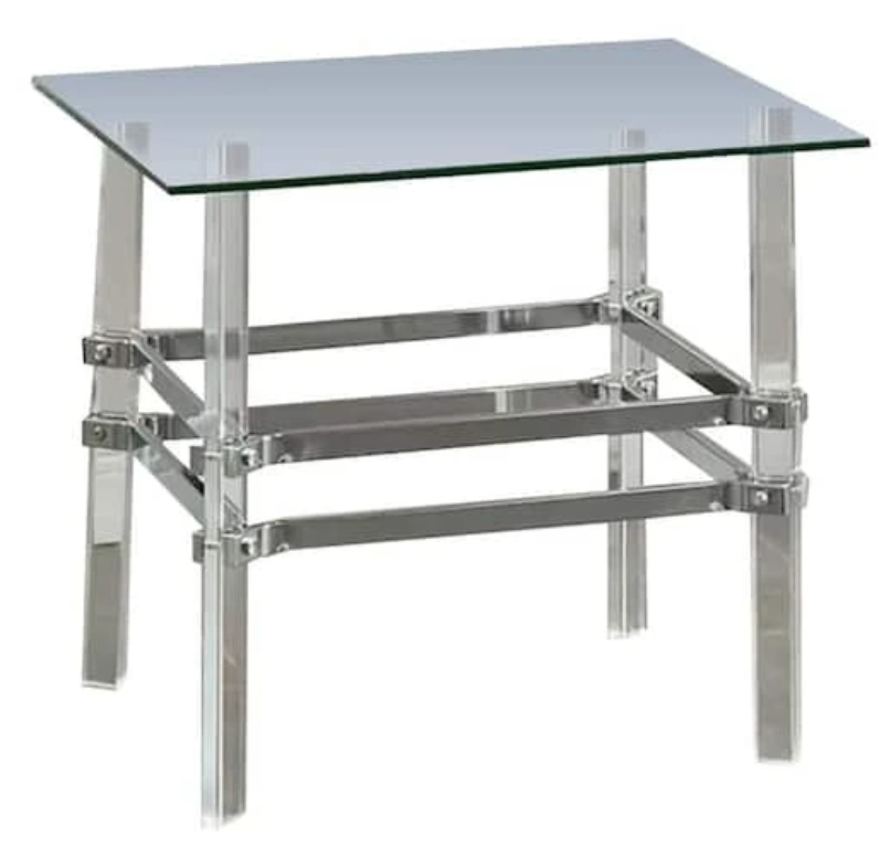Ghost tables that take a touch of industrial influence. The chrome stretcher framing is reminiscent of bracket structures, and riveted into the acrylic legs. That unapologetic use of function as form gives a touch of character to these tables that hide in plain sight.