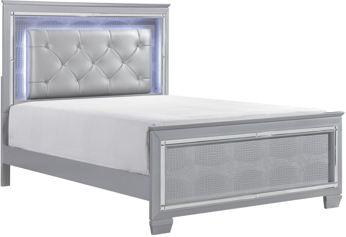 The silver faux leather crystal-tufted headboard insert boldly accents the silver finish.
