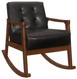 Mid-century modern lines define the profile of the Auden collection rocking chair. Contoured arms top the framing of the rocker rails. The button-tufted back and plain seat of the chair are covered in dark brown faux leather upholstery, with a walnut finish over solid wood.Read More