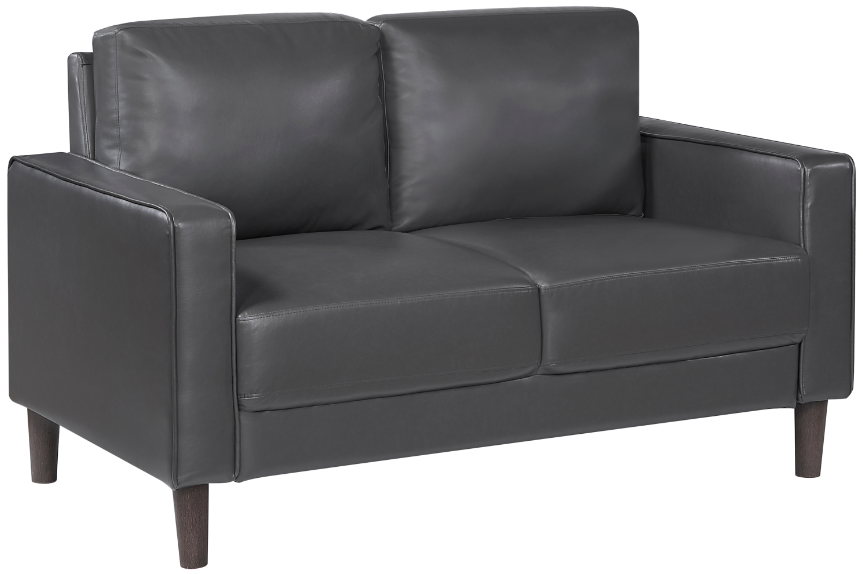 The collection is covered in dark gray faux leather upholstery further lending to the decorative versatility of this modern-classic offering.