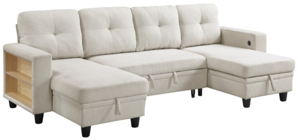 Seamlessly transition from a spacious seating area to a convenient pull-out bed, accommodating overnight guests with ease. Integrated side shelves provide additional storage and display space, while built-in USB charging ports keep your devices powered up and within reach. The neutral beige fabric upholstery complements any décor, and the plush cushions ensure both comfort and versatility. This sectional is the ultimate solution for those seeking a stylish and highly functional centerpiece for their home.