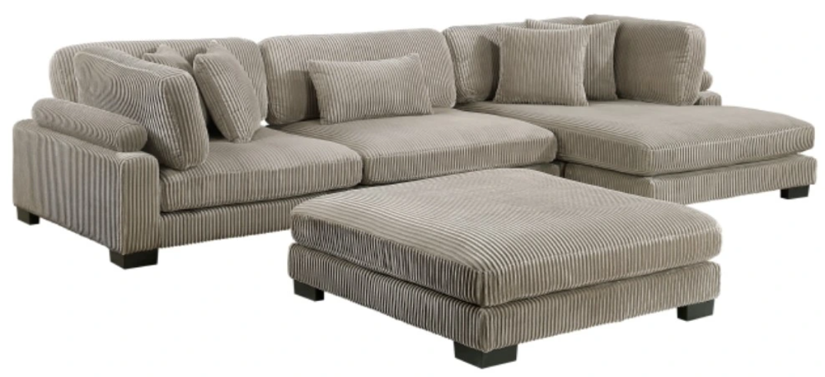Configurable to your available space, the Traverse Collection allows for the addition and detachment of pieces for a customized seating experience. The 4-piece sectional configuration consists of one corner unit paired with one armless chair, a chaise, and an ottoman. The taupe corduroy fabric upholstery creates a plush expanse for a soft touch experience.Read More