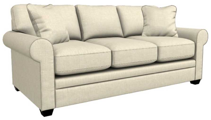 Rolled arms, decorative wood legs and welt trim lend laid-back sophisticated style