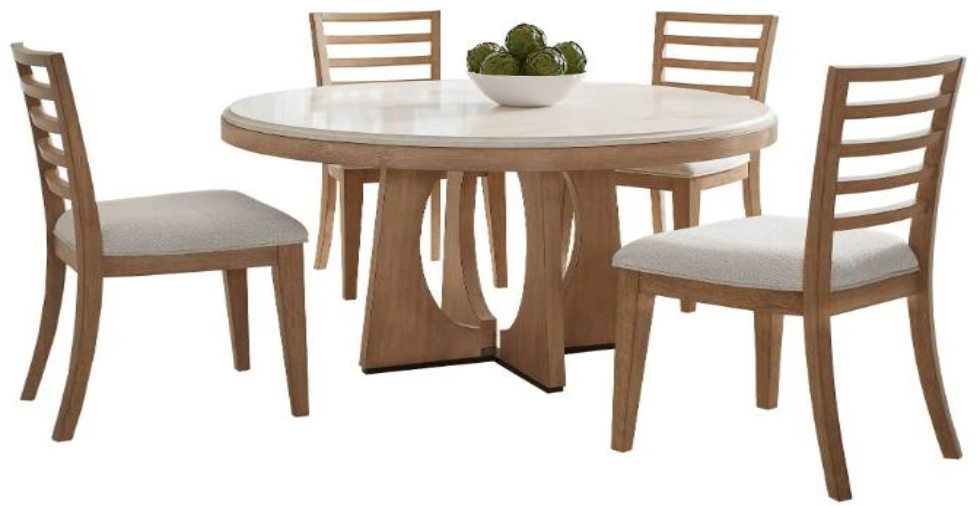 Set includes stone top 54" round dining table and four coordinating ladderback chairs from the Escape collection
