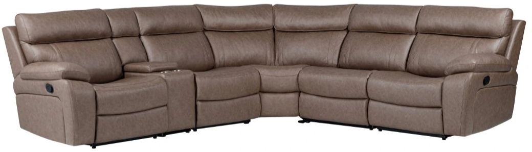 The generously sized six-piece Theon Sectional features easy-to-operate latches for reclining, a power center seat with the center-back doubling into a pull-down console table outfitted with cup holders. Theon's contoured bucket-style seats combine with generously-stuffed plush arms and a bustle-back pillow headrest for full body-conforming comfort.Read More