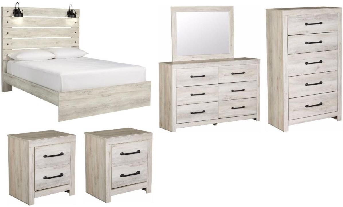 Includes panel bed with storage (headboard, footboard and rails), two 2-drawer nightstands, 6-drawer dresser with mirror, 5-drawer chest and two 2-drawer nightstands