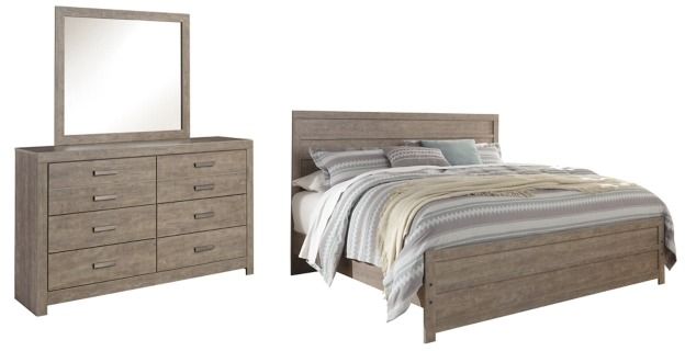 Includes king panel bed (headboard, footboard and rails), 6-drawer dresser with mirror