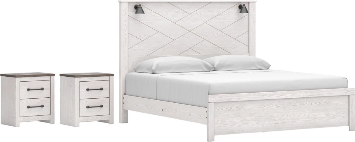 Package includes queen panel headboard, footboard and 2 nightstands