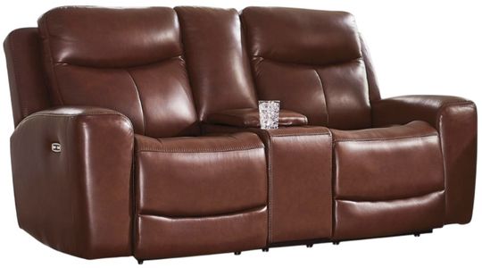 Prepare to be moved. This power reclining loveseat with console combines sleek modern design with all the soothing features you've been dreaming of. Wrapped in mahogany leather and faux leather upholstery for affordable luxury, this highly contemporary piece with cozy scoop seating suits your relaxed vibe.Read More