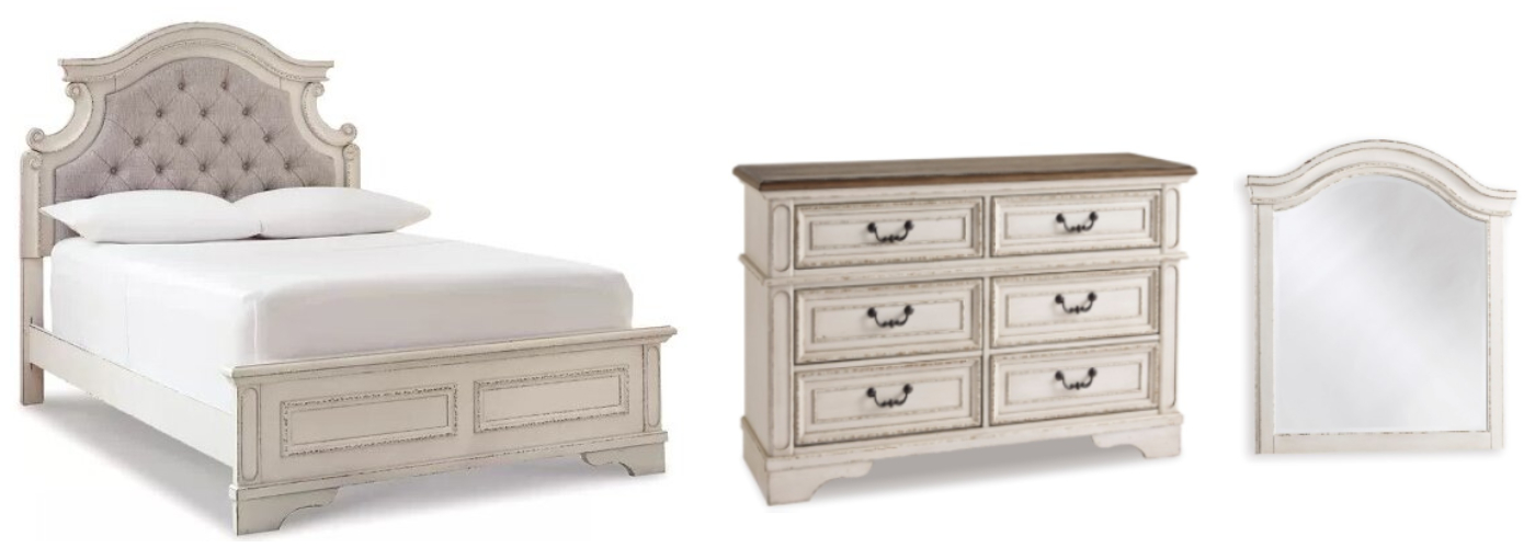 Includes bed (with upholstered headboard, footboard and rails) and dresser with mirror