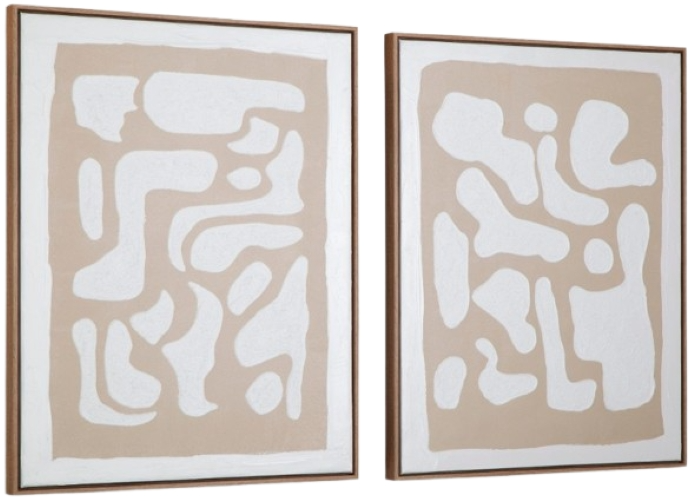 The abstract shapes and neutral hues of this wall art set are a reflection of your modern taste. Hand painting highlights the attention to craftsmanship, with light brown frames elegantly completing the duo. And each piece hangs four ways, giving you the flexibility to switch up their staging.Read More