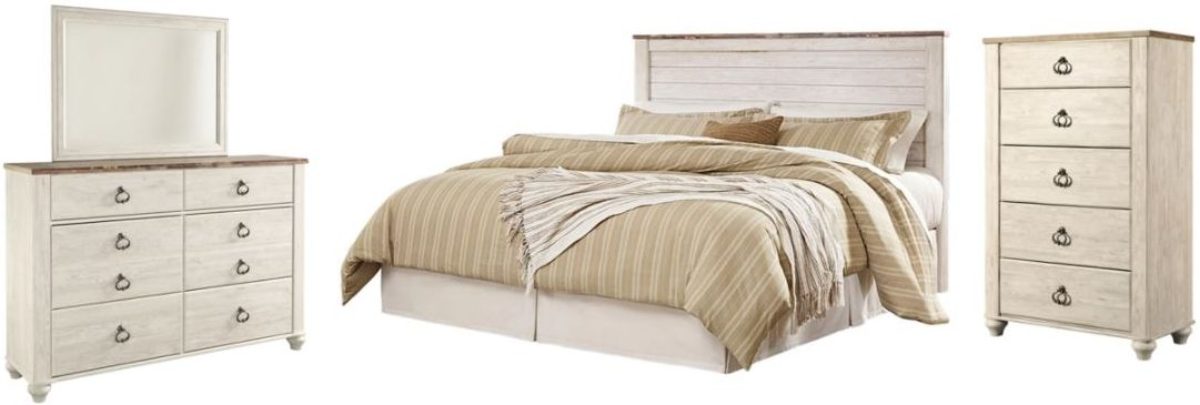 Includes King/California king panel headboard, 6-drawer dresser with mirror and 5-drawer chest