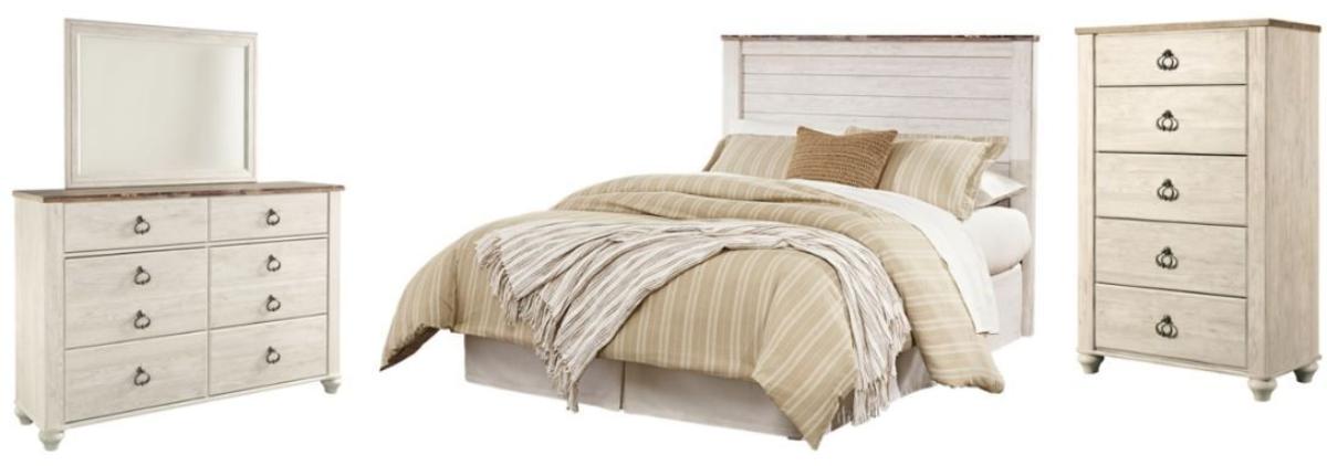 Includes queen/full panel headboard, 6-drawer dresser with mirror and 5-drawer chest